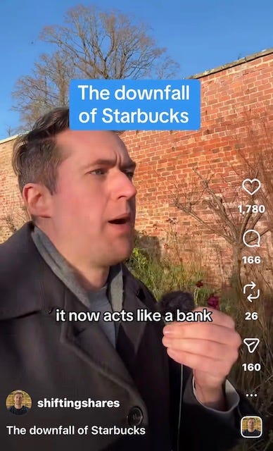 There’s also a push back against the spread of the large international chains. Financial influencer Michael Taylor tells the 243,000 followers of his regular “Shifting Shares” posts on Instagram, and 55,000 on TikTok, to eschew the big tax avoiding multiples in favour of local independent businesses that contribute to the local economy, don’t act like a bank with their pre-loaded payments cards, and offer better coffee.